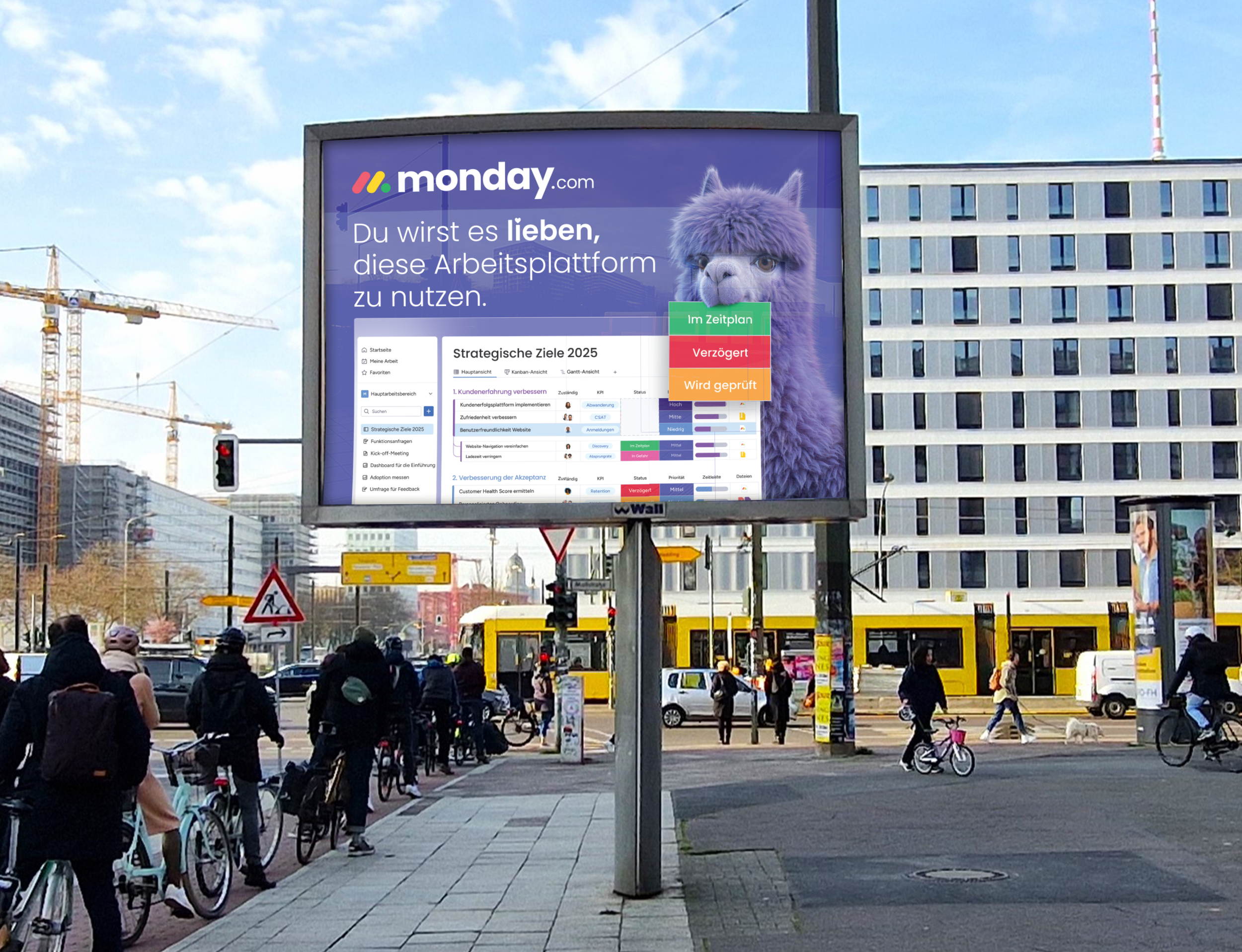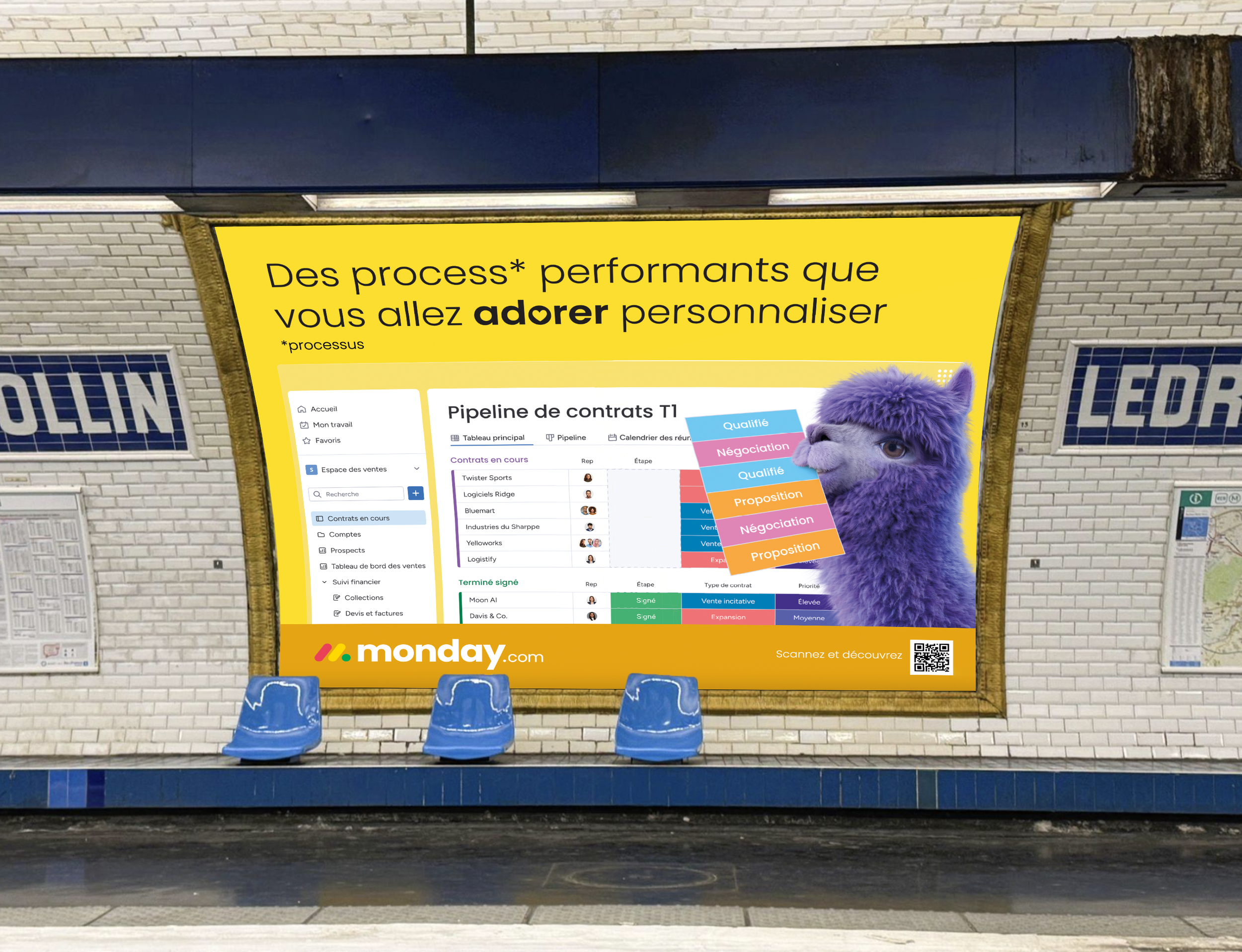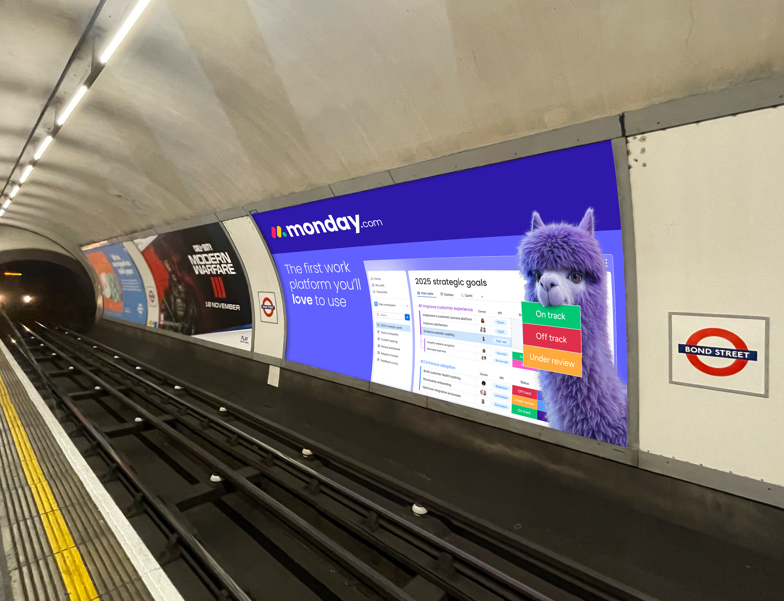 monday.com is a work management platform designed to help teams plan, track and manage their work. User research revealed that many users genuinely love using the platform, which became the foundation of the campaign. The campaign also marked the launch of the purple llama as a central brand character, created to stand out in public spaces and support long-term brand recognition.